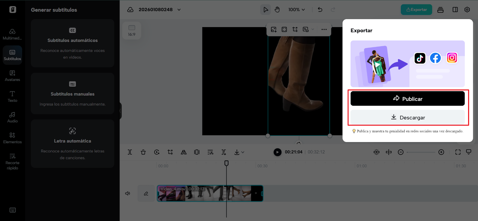 Previsualiza el video editado y realiza pequeños ajustes de opacidad, alineación o escala hasta que se sienta correcto. Luego exporta en alta resolución, selecciona la velocidad de fotogramas y el formato que prefieras, y publica de inmediato. La velocidad proviene de eliminar pasos innecesarios, no de apresurar decisiones.