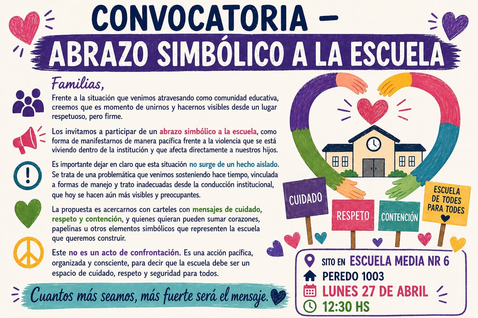 La convocatoria de las familias enfatiza que el abrazo simbólico no es un acto de confrontación, sino una necesidad de hacer visible una problemática sostenida en el tiempo. "Creemos que es momento de unirnos y hacernos visibles desde un lugar respetuoso pero firme", dicta el comunicado difundido en redes sociales. Se espera que la manifestación de este lunes 27 de abril marque un punto de inflexión para que las autoridades educativas provinciales tomen cartas en el asunto y garanticen la seguridad y el bienestar de los menores.