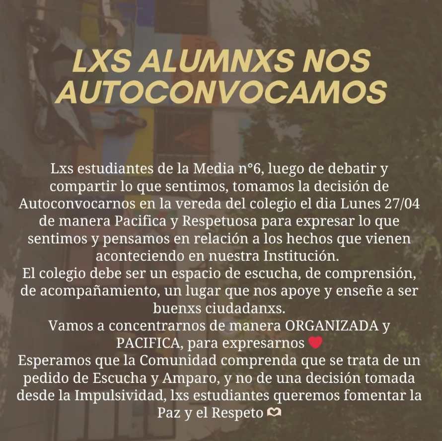 La comunidad educativa de la Escuela Media N° 6, ubicada en la calle Peredo 1003, sigue en estado de alerta. Tras una serie de episodios de violencia interna y denuncias contra la conducción del establecimiento, la directora Marian Guil, el Centro de Estudiantes y los cuerpos de delegados convocaron a una "sentada escolar" a partir de las 07:00 hs, mientras que las familias realizarán un "abrazo simbólico" a las 12:30 hs. La medida busca visibilizar una crisis que, según los protagonistas, ha vuelto insostenible la convivencia diaria.